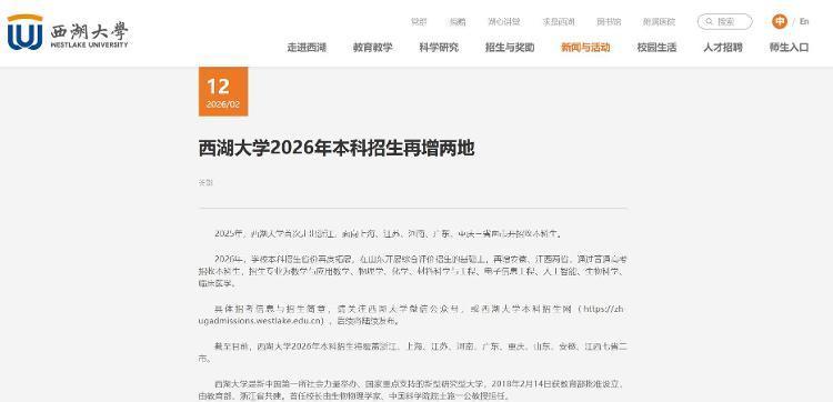 西湖大学2026年本科招生地区增加(来源:西湖大学网站)